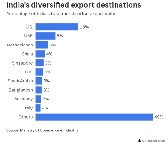 根据印度工商部的数据,印度商品的出口目的地也非常多样化,在 2023 - 2024 年,美国仅占其出口量的 18%。